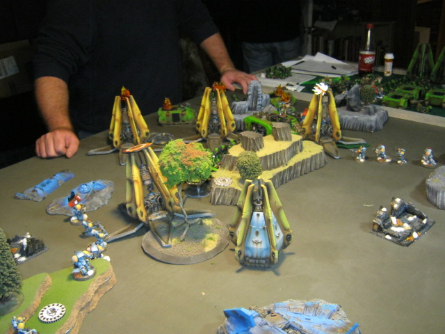 Because it was dawn of War, I choose to deploy one squad on my objective and keep their pod in reserve. That way I could get more troops out early and the empty pod would come down later to possibly contest an objective.